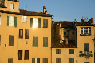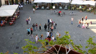 Nå, klokken seks, er det mørkt ute, men jeg hører noen som feirer bursdag på piazzaen.