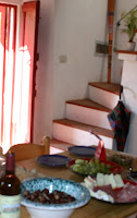 Graham har bil, og vi hadde en fin 20 minutters kjøretur på småveier, først i retning Pisa, så opp i høyden - fantastisk utsikt noen steder underveis - og inn i skogen, hvor veien endte som en blindvei ved huset. Huset var romslig, og både Graham og eierne før ham har gjort en god del restaureringsarbeid. Mye av det opprinnelige er beholdt, bl.a. bjelkene