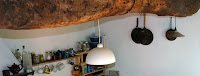 i taket på kjøkkenet, og steingulvene. En ny varmeovn og moderne belysning gjør huset lettere å leve i - det blir både kaldt og mørkt her.