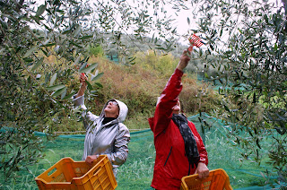 Vi plukker både svarte og grønne oliven - en jevn blanding gir den beste smaken på oljen. Noe klarer vi å plukke rett i kassene, resten samles i nettet som så rulles til en pølse. Dermed blir det lettere å få fangsten opp i kassene.