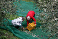 Villaens eier, Renzo, tar i mot oss og byr på kaffe - den lille koppen som jeg har lært meg å like, med sukker i - og kjeks. Deretter bærer vi tre kasser hver ned til feltet med oliventrær som skal høstes i dag. Det er lagt ut nett på bakken under trærne for å fange opp olivenene når de faller fra trærne. En kort orientering, litt veiledning, så er vi i gang. To "eksperter" fra naboeiendommen er med, de løsner frukten fra toppen av trærne med dertil egnet redskap (som jeg dessverre ikke har bilde av) - vi amatører plukker for hånd.