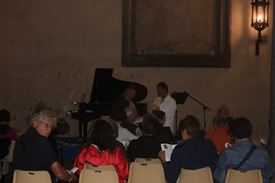 Det var satt opp stoler i den overbygde hallen ved piazzaen, og folk var begynt å samle seg selv om det enda var en stunde til konserten skulle begynne kl. 21.15 - det meste starter sent her.