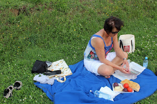 Vi har vandret rundt muren, men denne dagen var været deilig, så vi tok med oss det vi hadde i kjøleskapet - brød, ost, pølse, parmaskinke, tomater og litt frukt, og hadde en fin picnic på muren. Her kom fleecepleddet fra Torre del Lago til nytte.